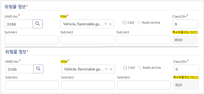 30 Dec 2025 2026년 IATA DGR 개정에 따른 Vehicle (자동차, 오토바이, 전기자전거 등) 화물의 특수화물코드 변경 사항과 화물 홈페이지 예약 유의사항을 안내드립니다. 위험물 예약 및 운송 관련 문의사항은 가까운 대한항공 화물 지점으로 연락 주시기 바랍니다. 1. IATA DGR 67판 변경 사항 (특수화물코드 변경) ㅇ Vehicle(자동차, 오토바이, 전기자전거 등) 화물의 동력원에 따른 특수화물 코드 구분 적용 (기존 ‘RMD’ 적용) UN Number Proper Shipping Name 특수화물코드 (SCC Code) 기존 (2025) 변경 (2026) UN 3166 Vehicle, flammable gas powered RMD RVF Vehicle, flammable liquid powered RMD RVF Vehicle, fuel cell, flammable gas powered RMD RVF Vehicle, fuel cell, flammable liquid powered RMD RVF Vehicle, flammable liquid powered, hybrid RMD RVH Vehicle, flammable gas powered, hybrid RMD RVH UN 3556 Vehicle, lithium ion battery powered RMD RVB UN 3557 Vehicle, lithium metal battery powered RMD RVB UN 3558 Vehicle, sodium ion battery powered RMD RVB UN 3171 Battery-powered vehicle RMD RVO 2. 화물 홈페이지 변경 사항 및 예약 유의사항 1) 화물 홈페이지 변경 사항 (예약 화면) ㅇ Vehicle 관련한 아래 품목에 자동 적용되는 특수화물코드 (SCC Code) 변경 - 대상 품목 : AUTOMOBILE, MOTORVEH (기존 : RMD → 변경 : DGR) ㅇ 위험물 정보란에 UN3166 입력 시, 조회되는 Proper Shipping Name 리스트 개정 - Vehicle, flammable gas powered (SCC Code : RVF) - Vehicle, flammable gas powered (SCC Code : RVH, Hybrid 차량용) - Vehicle, flammable liquid powered (SCC Code : RVF) - Vehicle, flammable liquid powered (SCC Code : RVH, Hybrid 차량용) 2) 예약 유의 사항 ㅇ 위험물 정보란 입력 및 PSN 선택 시, 우측의 특수화물코드(SCC) 확인 후 해당되는 항목으로 예약 진행 3. 적용 일자 : 2026년 1월 1일 부 (출발지 기준) 감사합니다.